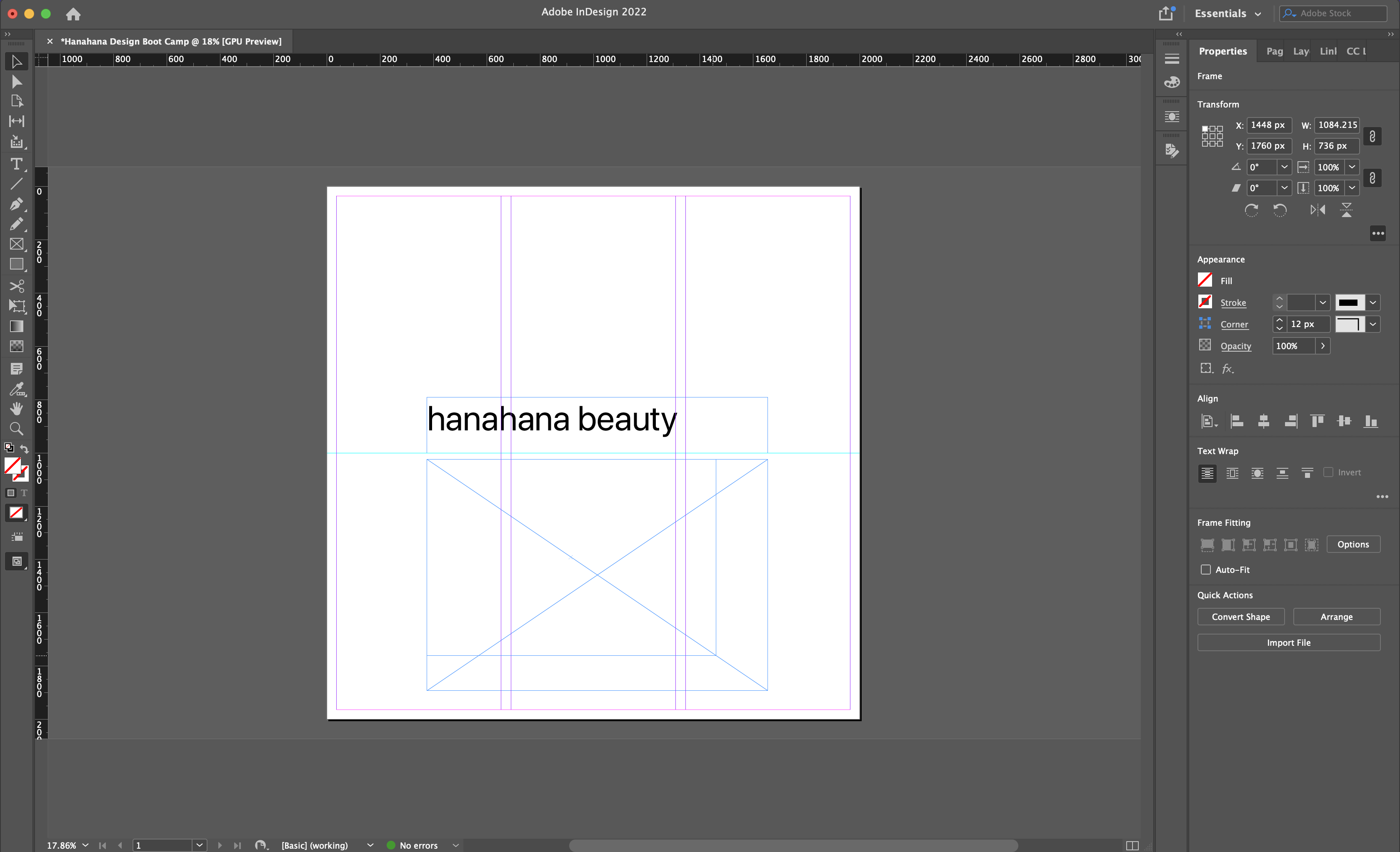 - Place a frame in the document where you want your image to go using the graphic frame button (square with x) in the tools panel